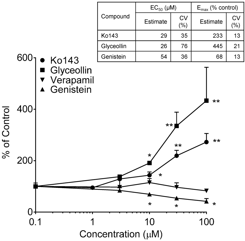 2.2.2. Effects of Glyceollin and Genistein on CDF Transport
