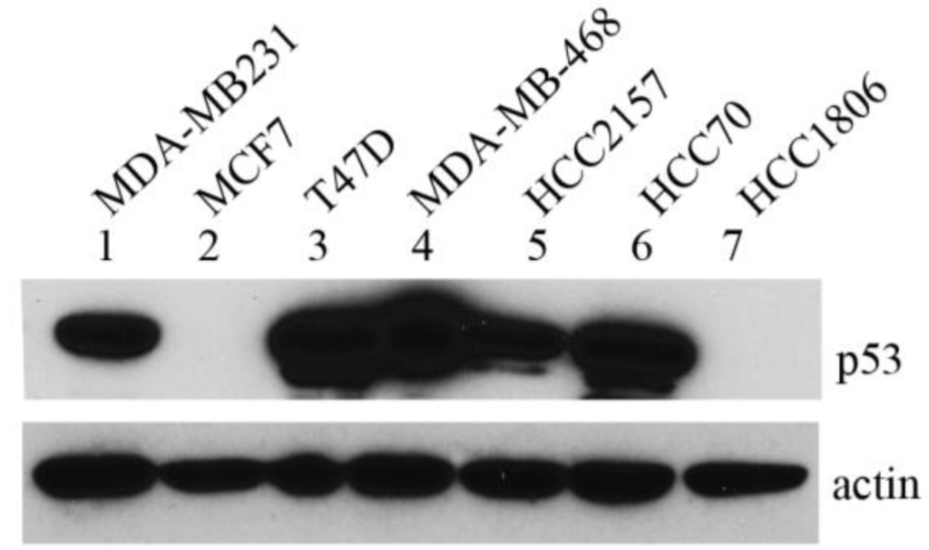 mtp53 is highly expressed in breast cancer cell lines. Expression of p53 protein in a panel of breast cancer cell lines: MDA-MB-231, MCF7, T47D, MDA-MB-468, HCC2157, HCC70 and HCC1806 and (lanes 1–7, respectively). 50 μg of protein extracted from different cell lines using RIPA buffer, were separated by gradient 4%–12% SDS/PAGE and analyzed by western blot using antibody to p53. Actin was used as a loading control. A representative blot is shown.