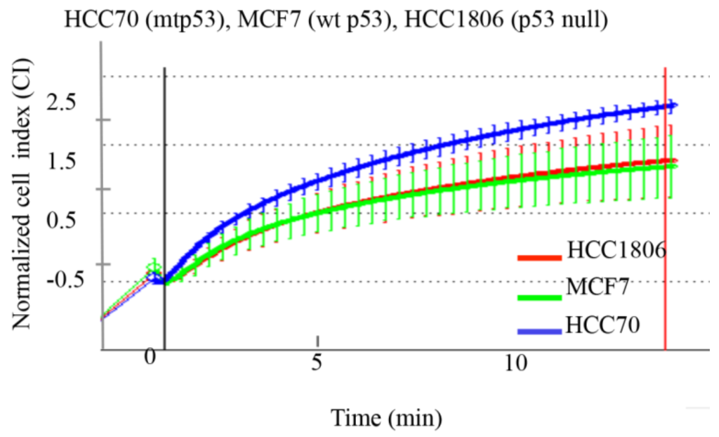 We are able to detect the GOF mtp53 phenotype of R273H and R280K in MDA-MB-468 cells and MDA-MB-231 cells by impedimetric detection under hyposmotic pressure [9]. We therefore asked if the expression of mtp53 R248Q in the AA-derived HCC70 cell line demonstrated increased deformability when compared to the p53 null AA-derived breast cancer cell line HCC1806 and the wild-type p53 expressing cell line MCF-7. We observed increased deformability of HCC70 cells (blue line), while the MCF-7 and HCC1806 cells showed lower and very similar deformability kinetics (Figure 2).
