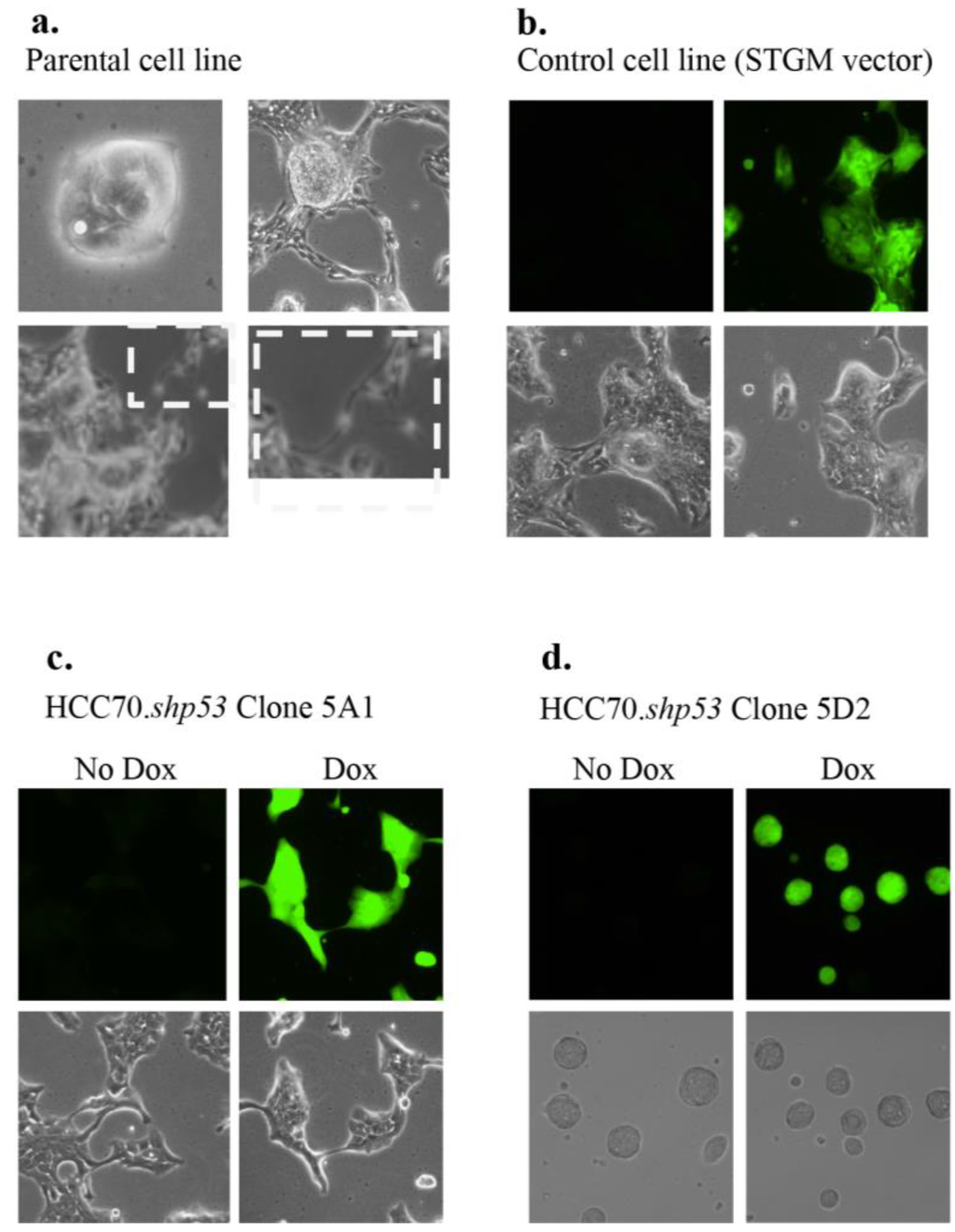 Morphology of HCC70.shp53 5A1 and 5D2 diverge from that of parental cell line. (a) Images of light microscopy of live HCC70 parental cell (boxed panel shows increased magnification on the right of the same region boxed on the left) and (b) STGM-control cell lines are shown. Fluorescent microscopy showing GFP indicates that Dox was added to the culture conditions. In the STGM-control there was no mtp53 knockdown. During cloning of the HCC70.shp53 pool we isolated clones that were representative of each type of morphology. (c) Specifically, HCC70.shp53 5A1 exhibited branched colony structures only (bottom left) and (d) HCC70.shp53 5D2—stem cell-like round colony morphology.