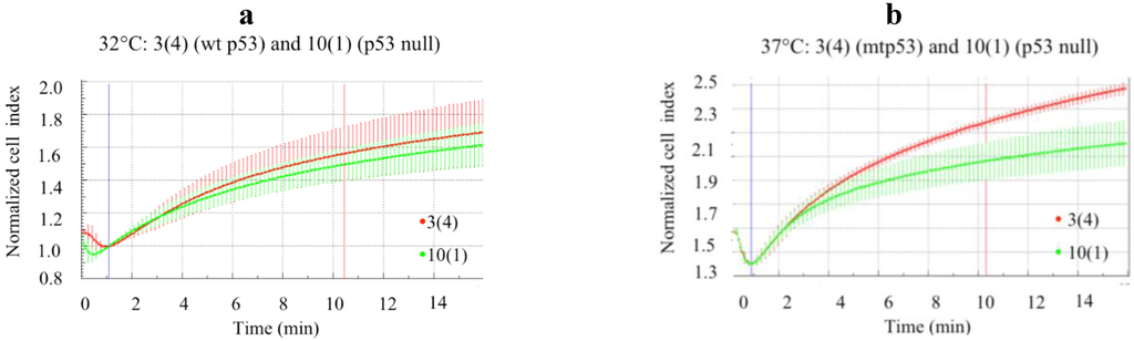 Increase in expression of GOF mtp53 was associated with increased deformability. Change in cell impedance (expressed as normalized cell index) in isogenic p53 null cell line 10(1) or in the cell line 3(4) expressing ts p53 is shown. Cell lines were cultured at 32 °C for wtp53 conformation or at 37 °C to induce the mtp53 conformation in the 3(4) cell line, as described elsewhere [20]. (a) The normalized cell index (i.e., change in impedance) of 10(1) (green) and 3(4) (red) cells cultured at 32 °C were recorded to assess the effect of wt p53 expression on cell deformability and no differences were observed; (b) Impedance variations in 10(1) (green) and 3(4) (red) cells cultured at 37 °C (green) were recorded to assess the effect of mtp53 conformation expression on cell deformability. Average values and standard deviation at each time points are shown (n = 4). The first vertical line indicates the addition of water. The second vertical line (shown in red) was used to generate slopes of the curves (data not shown).