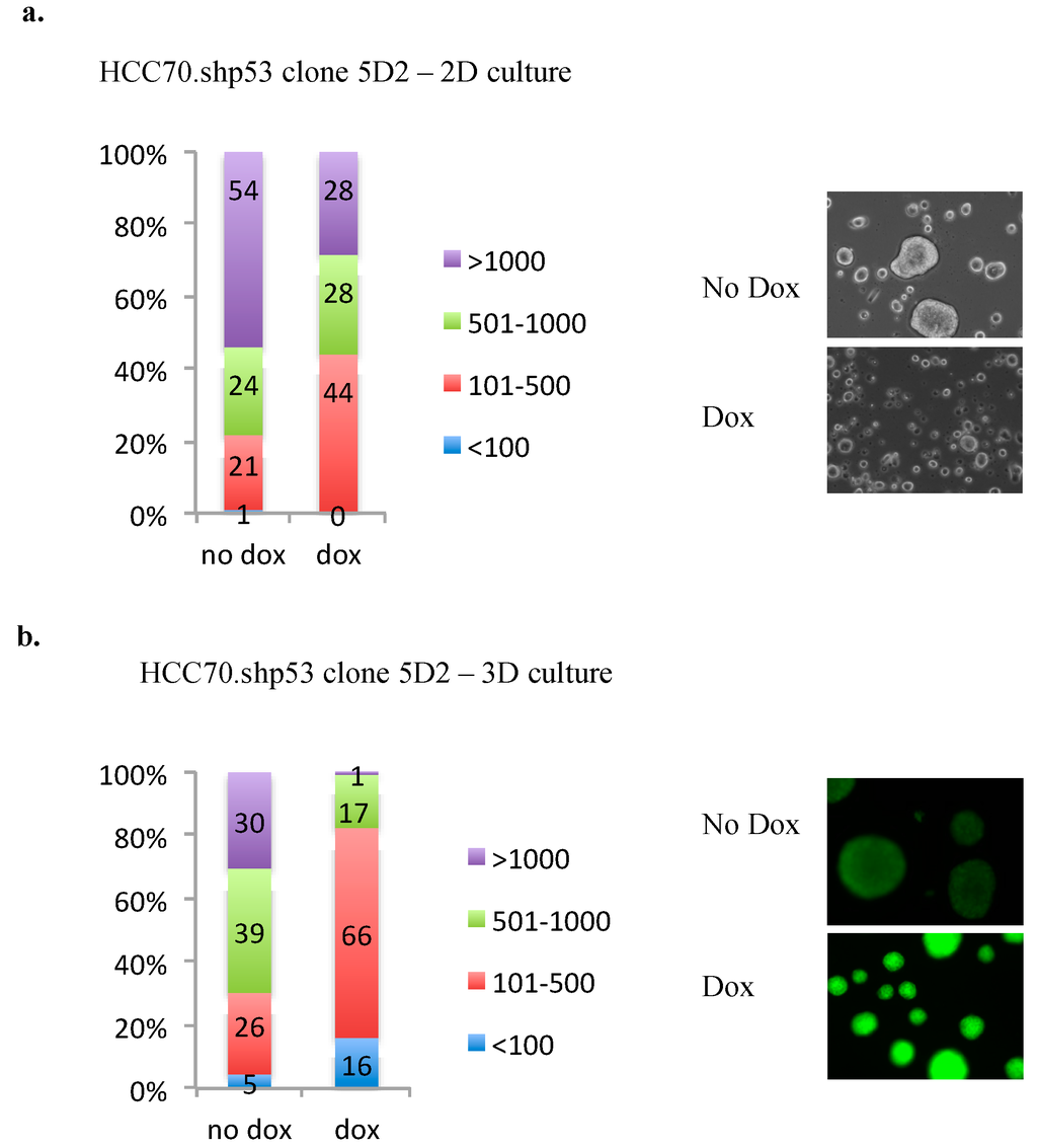 The HCC70.shp53 5A1 and 5D2 clones demonstrated some differences in flexibility and morphology. We were interested to determine if there were mtp53 associated phenotypes that could be detected in HCC70.shp53 5D2 that associated with mtp53 actions in a different clonal background. The 5D2 cells showed an interesting colony formation phenotype. We therefore asked if the 5D2 clone exhibited any of the other phenotypes previously associated with mtp53 R273H expression in MDA-MB-468 cells. MDA-468. shp53 cells show a mtp53-driven PARP association with the chromatin [14] and increased colony size when grown in 3D culture [13]. The knockdown of mtp53 in HCC70.shp53 5D2 reduced the colony size during cell culture in either 2-dimensions (2D) or 3-dimensions (3D) (Figure 8a,b). These colony formation assays were only carried out with 5D2 and not 5A1, in order to determine if there was a mtp53 associated phenotype in 5D2 cells.