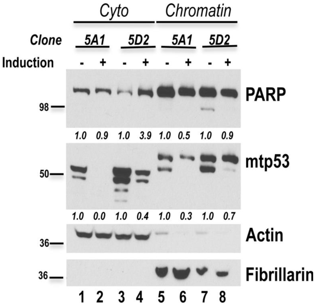 Depletion of mtp53 modulates PARP expression. HCC70.shp53 clones 5A1 and 5D2 were grown in the presence or absence of 6 μg/mL of doxycycline for 7 days and fractionation was carried out. Samples were resolved on a gradient 4%–12% SDS/PAGE which resulted in the observation of differentially migrating p53 in cytoplasmic and chromatin fractions [14]. A total of 50 μg of protein from the cytoplasmic fraction and 10 μg of the chromatin fraction per lane were resolved. Protein levels of p53, PARP1, actin, and fibrillarin in the fractions were determined by western blot analysis and the results were quantified by ImageJ. Actin was used to normalize the cytoplasmic fractions and fibrillarin was used to normalize the chromatin fraction (relative expression values comparing with and without knockdown are shown under the PARP1 and mtp53 western blots).