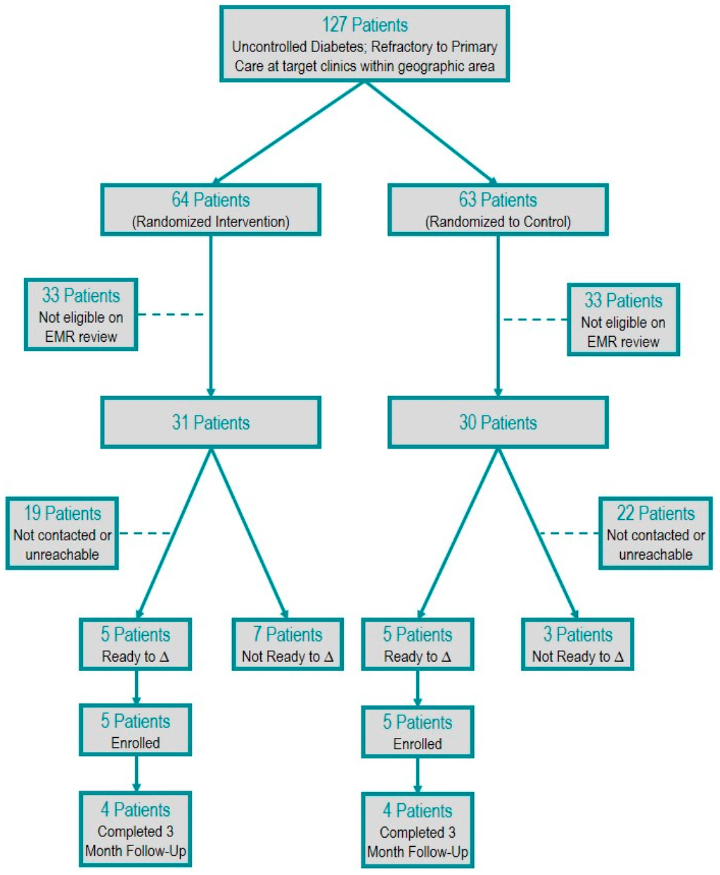 One-hundred twenty-seven high-risk, potentially eligible participants were randomized. Sixty-one met eligibility criteria, and 36 had contact attempted. Twenty-five patients had no contact attempts due to the resource limitations of the study personnel. Of the 36 patients for whom contact was attempted, 16 patients were unable to be reached after three attempts and, thus, were excluded. Twenty patients (32%) were contacted and screened for readiness to change. Of the 20 patients contacted, 10 patients screened out on the readiness to change survey, and 10 patients screened in and were enrolled. Eight of the enrolled patients completed the final three-month follow-up (Figure 1).