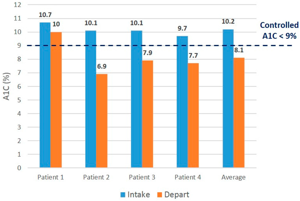 The intervention patients accessed more PCMH services compared to the control patients (median nine points of access vs. four points), as well as more PCMH phone contact (median three phone contacts vs. zero phone contacts) (Table 2). All participants in the intervention group showed improved hemoglobin A1C values, and three out of four control participants showed improved values (Figure 3 and Figure 4). Three out of four intervention participants and two out of four control participants demonstrated post-hemoglobin A1C values meeting the a priori definition of “not poorly controlled” or hemoglobin A1C of less than 9%.
