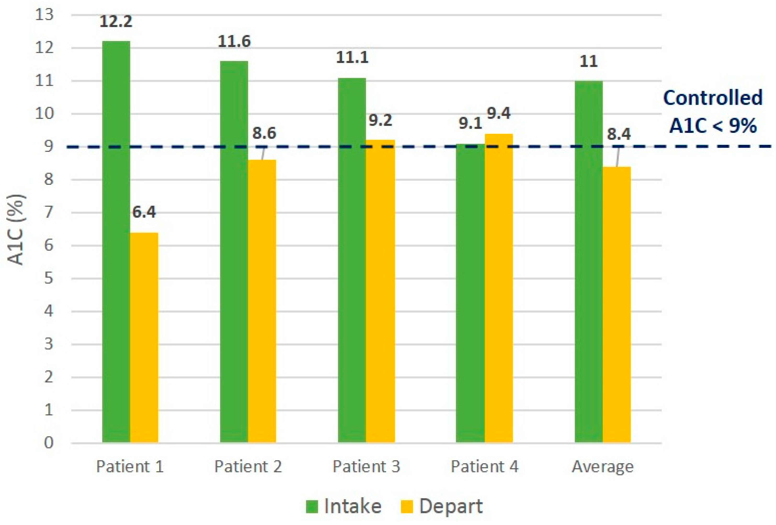 Initial vs. final Hgb A1C values for intervention patients.
