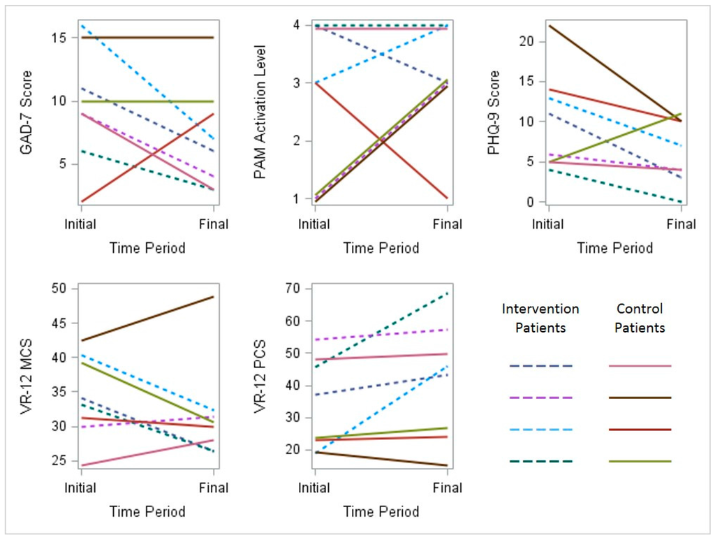 Scores for depression, anxiety, activation and perceived quality of life were documented for participants in both groups at the time of enrollment and the completion of the study. This limited dataset is described in graphical form (Figure 5).