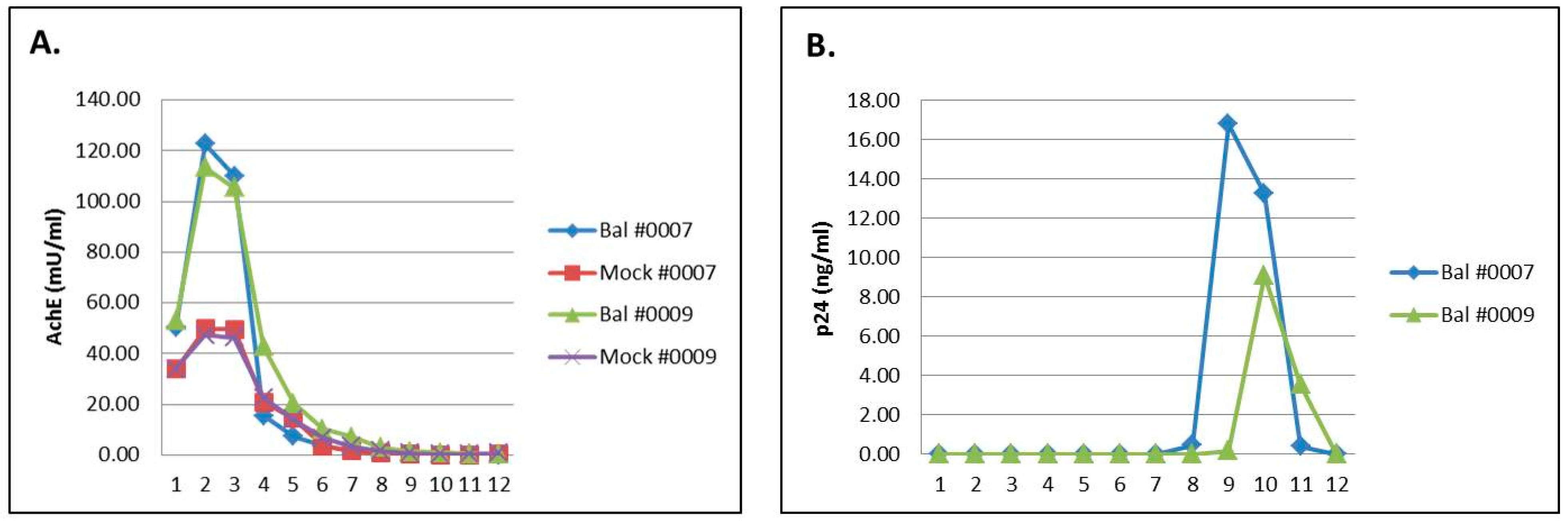 (A) Acetylcholinesterase (AchE) activity in iodixanol gradient fractions from HIV-1-infected and mock-infected culture media. HIV-1 virus particles and exosomes were concentrated from culture media by centrifugation and layered on iodixanol gradients. Gradient fractions were individually assayed and AchE activity in milliunits/mL was plotted for each fraction. (B) HIV-1 p24 capsid protein concentration in gradient fractions from HIV-1-infected and mock-infected culture media. HIV-1 virus particles and exosomes were concentrated from culture media by centrifugation and layered on iodixanol gradients. Gradient fractions were individually assayed and HIV-1 p24 concentration in ng/mL was plotted for each fraction.