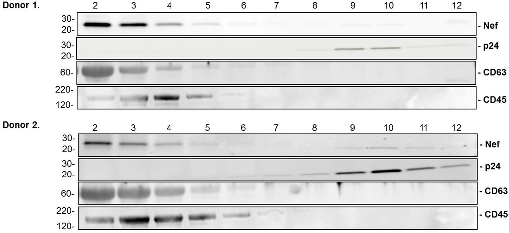 Western blotting of proteins in exosome preparations from HIV-1-infested MDM. The proteins in individual iodixanol gradient fractions 2-12 from HIV-1-infected MDM from donors 1 and 2 were separated by SDS-PAGE and transferred to polyvinylidene fluoride (PVDF) membranes. The membranes were incubated with antibodies to exosomal proteins CD 45 and CD 63 and HIV-1 proteins p24 and Nef.