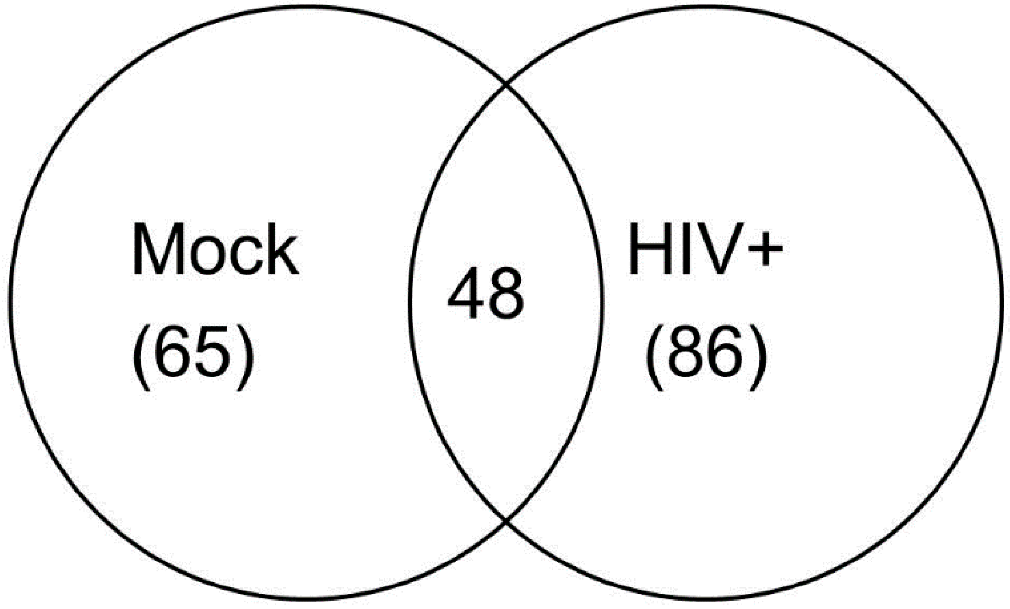 Venn diagram showing the numbers of miRNAs detectable only in mock-infected cell exosomes (65), only in HIV-infected cell exosomes (86), and in at least one exosome sample from both mock- and HIV-infected cells (48).