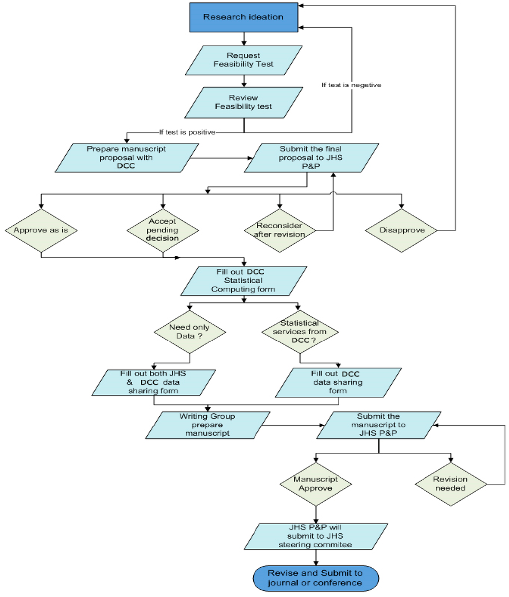 Procedure for manuscript development: The DCC developed the manuscript development procedure, which was combined with the Jackson Heart Study policy and procedure. It was important to include JHS rules and guidelines in the DCC procedure. The flow chart depicts the procedure for study development (Figure 1).