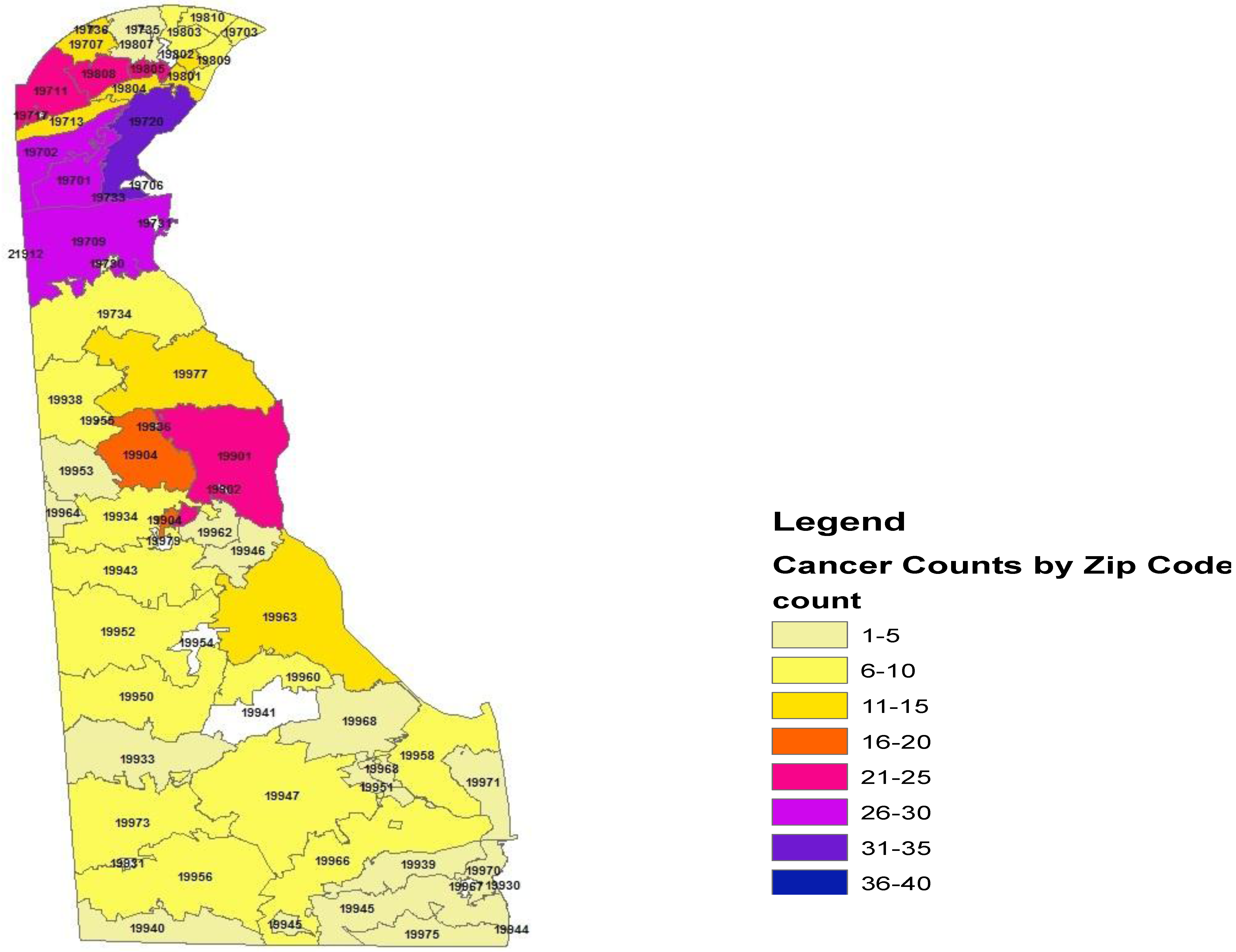 Geo-mapping of the State of Delaware Childhood Cancer, 2004–2014.