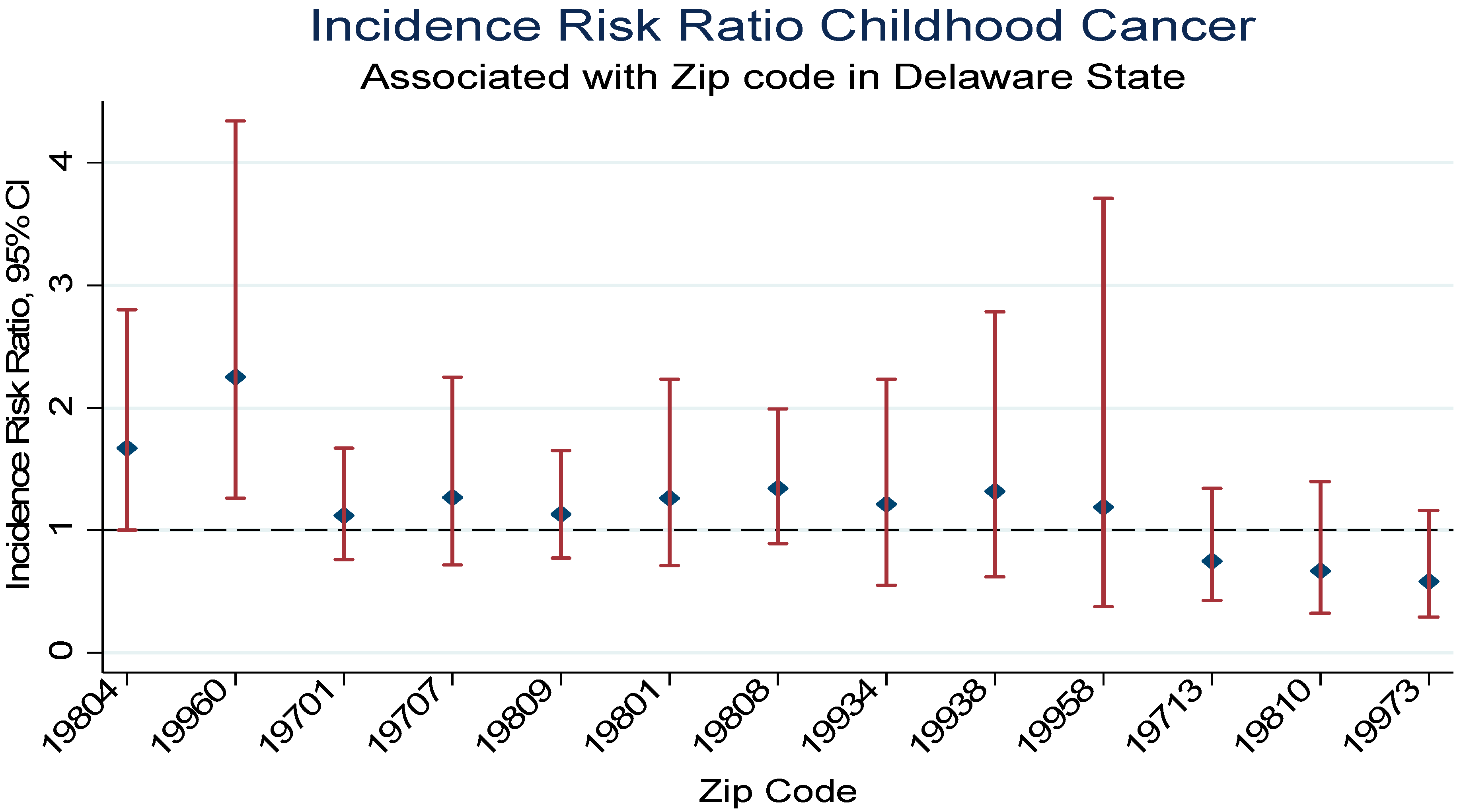 Table 2 demonstrates the incidence risk ratio of pediatric malignancy by zip code using the state of Delaware as the reference group and the 2010 Census data as the population size for the pediatric age (0 to 17 years). Relative to the state of Delaware the cumulative incidence rate was higher in zip code 19804 with a significant 68% increase risk of developing pediatric cancer of all sites IRR = 1.68, 95% Confidence 1nterval (CI), 1.0–2.8, p = 0.04. There were a total of 15 cancers diagnosed with seven malignancies between 2004 and 2008 and eight malignancies between 2009 and 2014 in zip code 19804. Additionally, an estimated nine malignancies were diagnosed among boys and six among girls. Acute lymphocytic leukemia accounted for three cases, CNS/Brain two cases, and lymphoma two cases. Other malignancies diagnosed included Acute myeloid leukemia (AML), renal, Hodgkin’s, endocrine gland, salivary gland, skin, placenta, and cancer of no specific site. Similarly, relative to the state of Delaware children in zip code 19960 were two times as likely to be diagnosed with childhood malignancy (IRR = 2.25, 95% CI, 1.26–4.34). Although imprecise, there were increased risk of childhood malignancies in 19701 (IRR 1.12), 19707 (IRR = 1.27), 19709 (IRR = 1.13), 19801 (IRR = 1.26), 19808 (IRR = 1.34), 19934 (IRR = 1.21), 19938 (IRR = 1.32), 19958 (IRR = 1.19) relative to the state of Delaware. In contrast, childhood malignancies were lower in zip codes 19713 (IRR = 0.75), 19810 (IRR = 0.67), 19966 (IRR = 0.67), 19973 (IRR = 0.58) compared to the state of Delaware. Figure 2 demonstrates the incidence risk ratio for selected zip codes.
