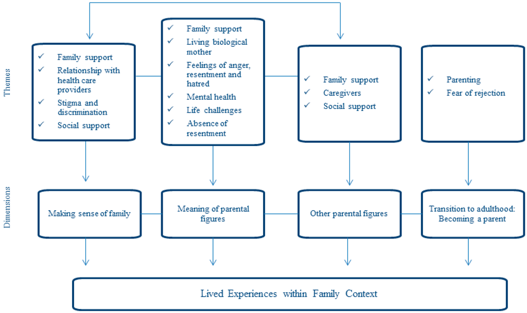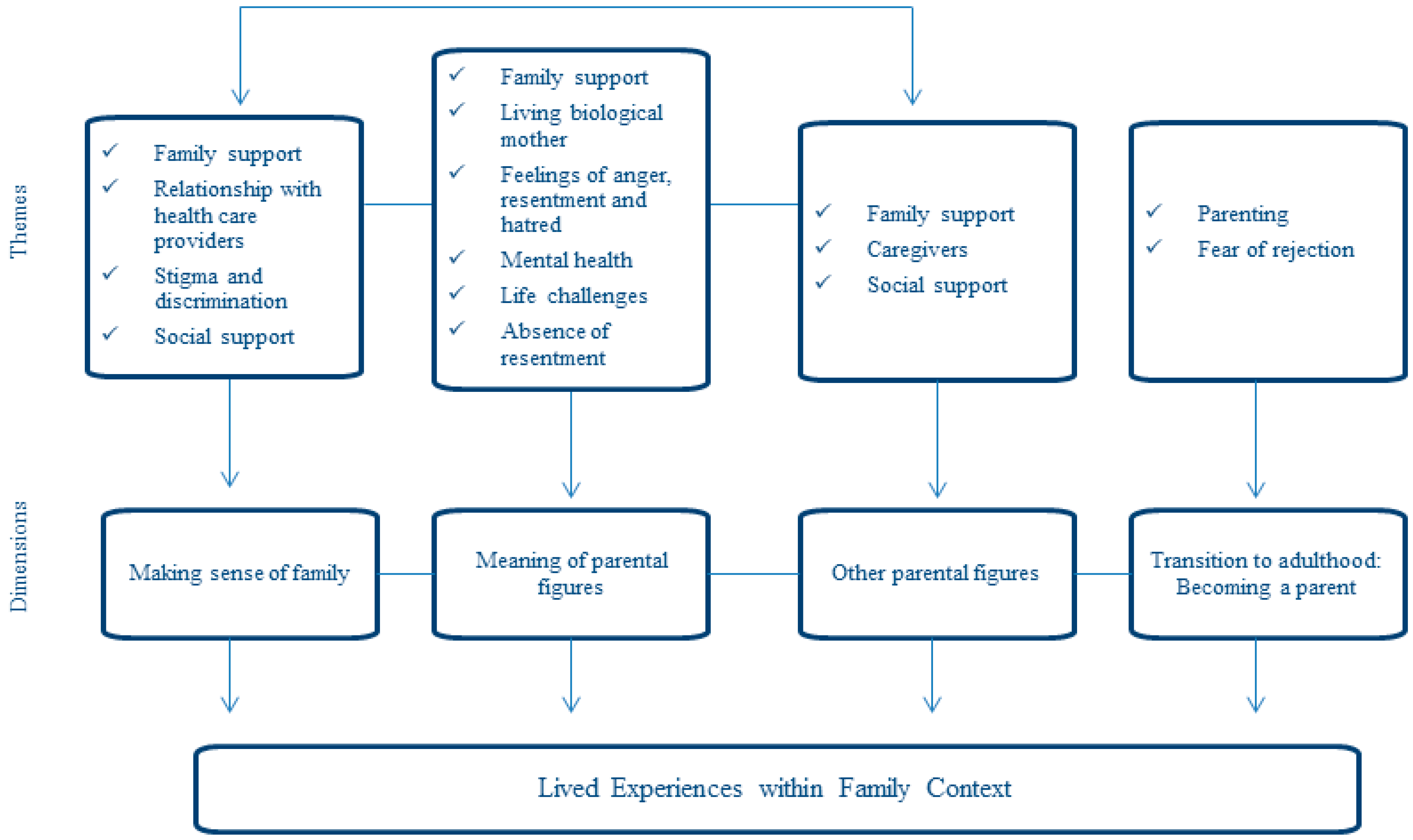 While exploring the life experiences of pHIV-I youth, family emerged as a central presence and foundation in their lives. Four broad dimensions were particularly highlighted from participants’ narrated life experience related to family: (1) making sense of family; (2) the meaning of parental figure; (3) the roles of other parental figures; and (4) the transition to adulthood: becoming a parent. These topics were recurring themes in participants’ interpretation of their life experiences related to their families. Fragments of participants’ narratives were selected to support each of the themes; informants were given fictional names to protect their identities.
