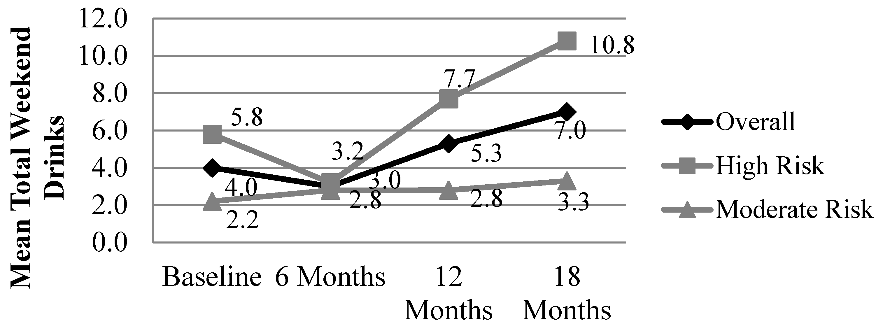 Repeated measures analyses of total drinks consumed over a weekend for only those women who completed CM (n = 50, see Figure 1) show a significant within-subjects main effect for time (F = 5.037, p = 0.029) and a significant between-subjects effect for risk group (F = 5.758, p = 0.020). There was a significant difference in weekend drinks at 18 months for individuals who are high-risk, dependent drinkers at baseline compared to those who report heavy drinking with fewer signs of dependency (F = 4.996, p = 0.030). The differences at baseline (F = 2.977, p = 0.091) and 12 months (F = 3.171, p = 0.081) trended towards significance, but did not meet the cutoff threshold. Post hoc analyses with Bonferroni adjustments for multiple comparisons did not show significant differences in drinking for specific sets of time points (i.e., drinking at baseline vs. twelve months).