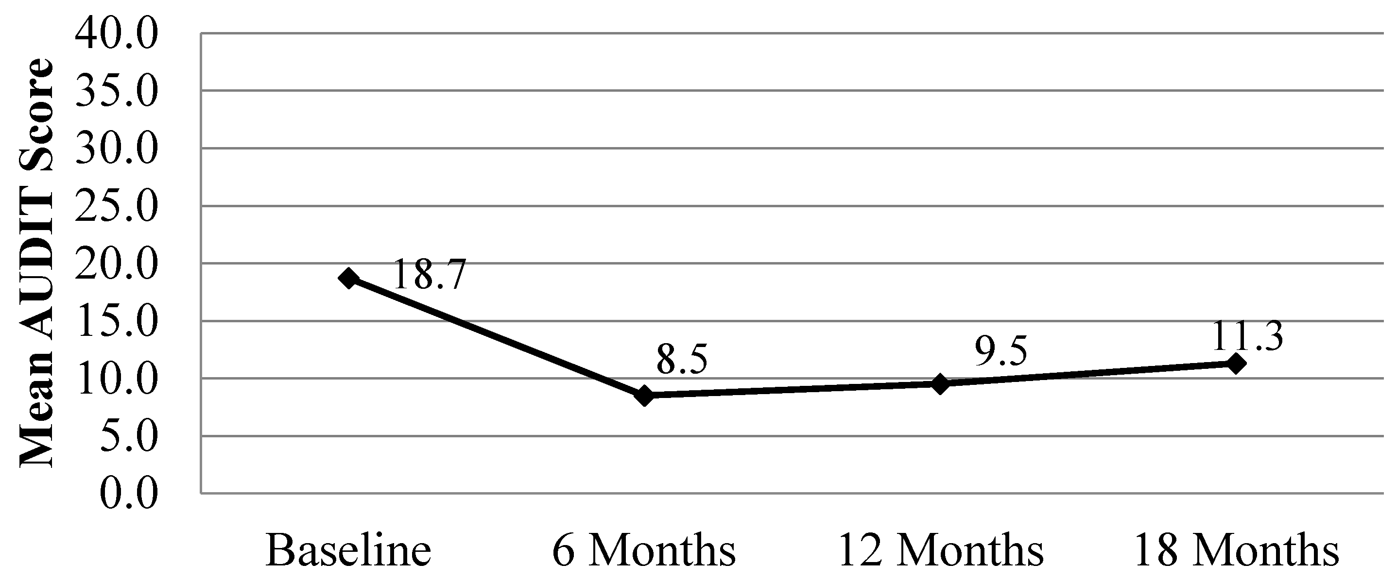 The AUDIT captures a more comprehensive set of drinking indicators than the seven-day drinking recall reported in Figure 1. In Figure 2 it is evident that AUDIT scores decrease significantly over time for women who completed case management (F = 23.323, p = 0.000). Comparisons between baseline AUDIT scores and scores at 6, 12, and 18 months show significantly higher AUDIT scores at baseline compared to each follow-up time point. One of the most beneficial outcomes that women experienced during CM was an overall reduction in problematic drinking.