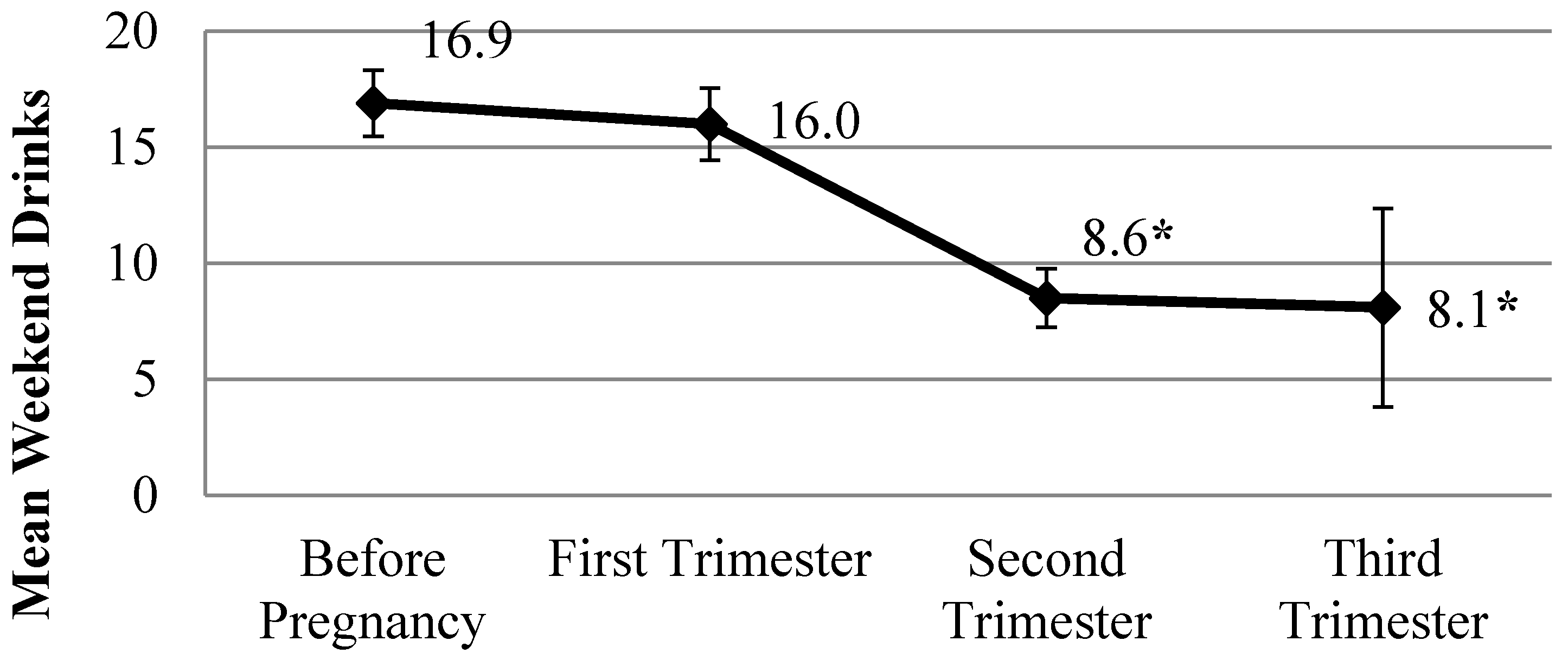 Typical weekend drinks during pregnancy reported at baseline. * p < 0.001; Paired samples t-test score comparing number of drinks consumed per weekend prior to pregnancy versus number of drinks consumed per weekend during each trimester.
