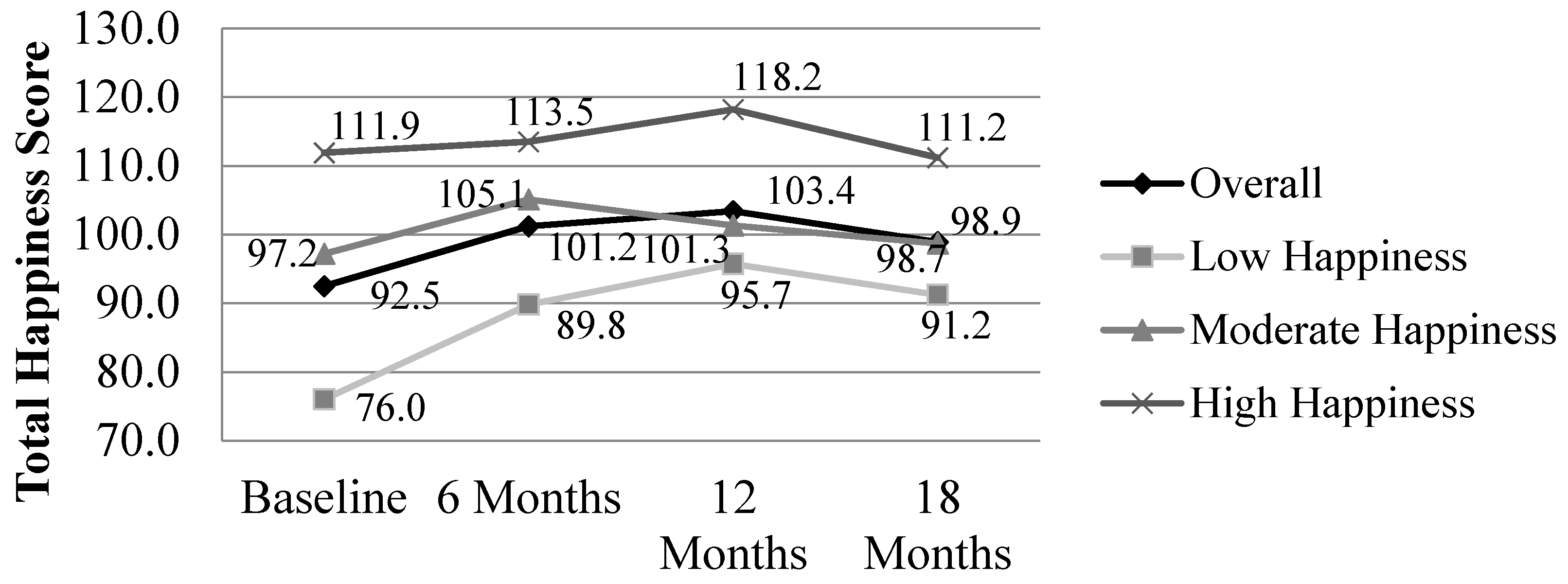 To further understand women’s level of happiness, individual scores were statistically trichotomized and labelled as low, moderate, or high happiness. Repeated measures analysis of happiness were significant by time (F = 6.148, p = 0.001), happiness group (F = 21.726, p = 0.000), and time x happiness group interaction (F = 2.302, p = 0.038) for women who completed CM (n = 50). Overall, happiness increases significantly for women from baseline to 6 months (p = 0.002) and 12 months (p = 0.001) before returning to near baseline levels at 18 months (p = 0.323). Individuals with low levels of happiness at baseline increased their level of happiness the most during CM; however those with the highest reported happiness at baseline also increased their level of happiness at 6 and 12 months.