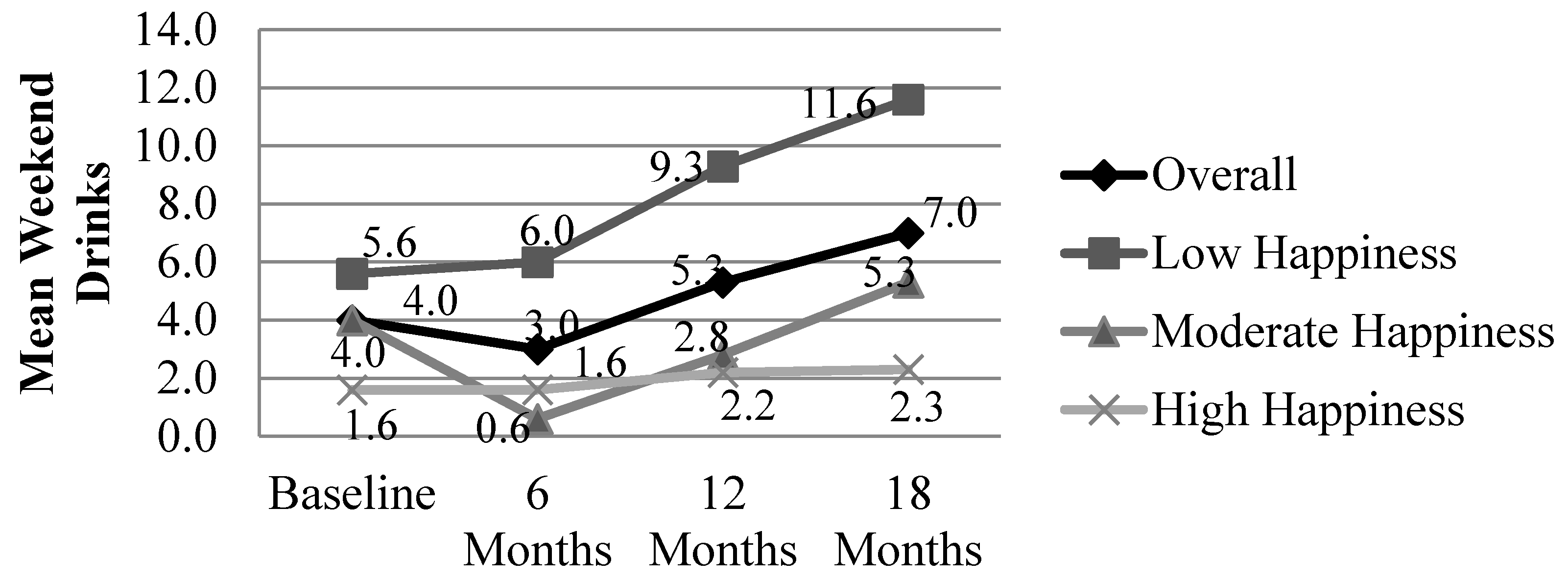 For women who completed CM (n = 50), repeated measures analyses of total happiness score and number of weekend drinks did not show significant differences by time (F = 2.185, p = 0.099) or time x happiness group interaction (F = 0.499, p = 0.792). However, results were significant based on women’s happiness group (F = 5.343, p = 0.008) indicating that those with low, moderate, and high levels of happiness showed different levels of weekend drinking. Those with the highest levels of happiness have the lowest levels of drinking at baseline and maintain the lowest levels of weekend drinks at 12 and 18 months. Comparatively, those with the lowest levels of happiness are the heaviest drinkers at baseline and all follow-up time points. Figure 5 portrays the lower levels of happiness associated with higher levels of weekend drinking at baseline and higher levels of happiness for those with the lowest levels of weekend drinking at baseline and throughout the duration of CM.