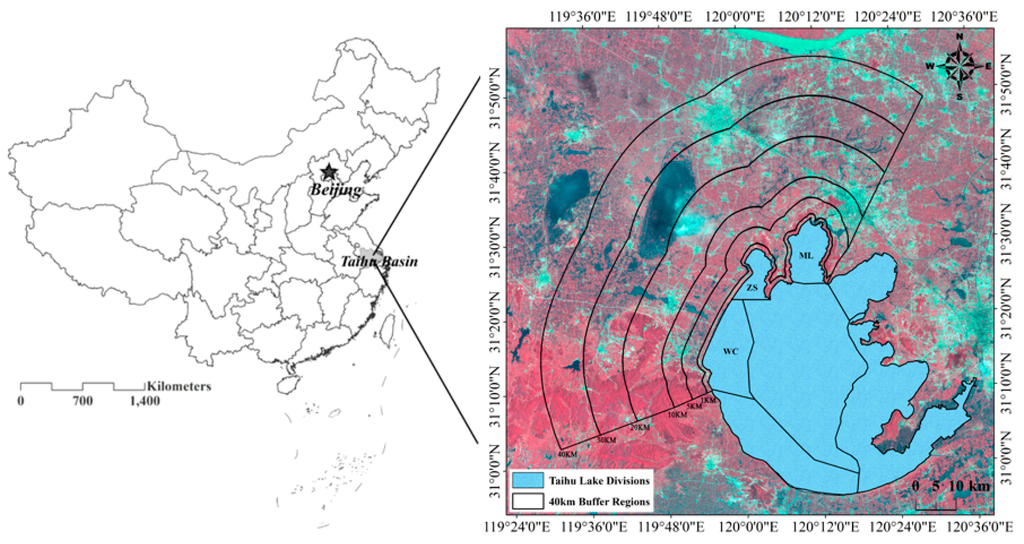 Six watershed buffer regions around the three lake divisions were selected using ArcGIS 10.0 based on different distances to the lake boundary. The buffer distances were 1 km (B1), 5 km (B5), 10 km (B10), 20 km (B20), 30 km (B30) and 40 km (B40) (Figure 1).