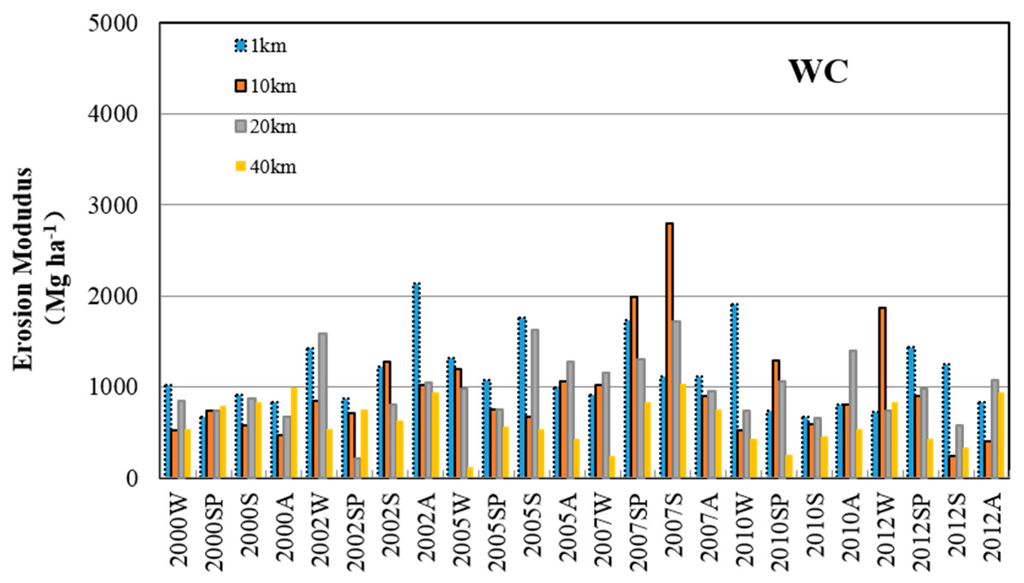 The soil erosion modulus calculated by RUSLE varied significantly over the six selected years within the 12 year period (Figure 2) and showed clear differences between lake areas. Generally, the WC region was eroded slightly when compared with the other regions, and the ZS region had the severest erosion intensity, with the erosion modulus exceeding 3000 Mg·ha−1 in most cases and even reaching higher than 4000 Mg·ha−1 for the 20 km buffer region in 2007. Moreover, the erosion modulus varied notably in the temporal series and with no regularity and reached a maximum value between 2005 and 2007 for all three regions.
