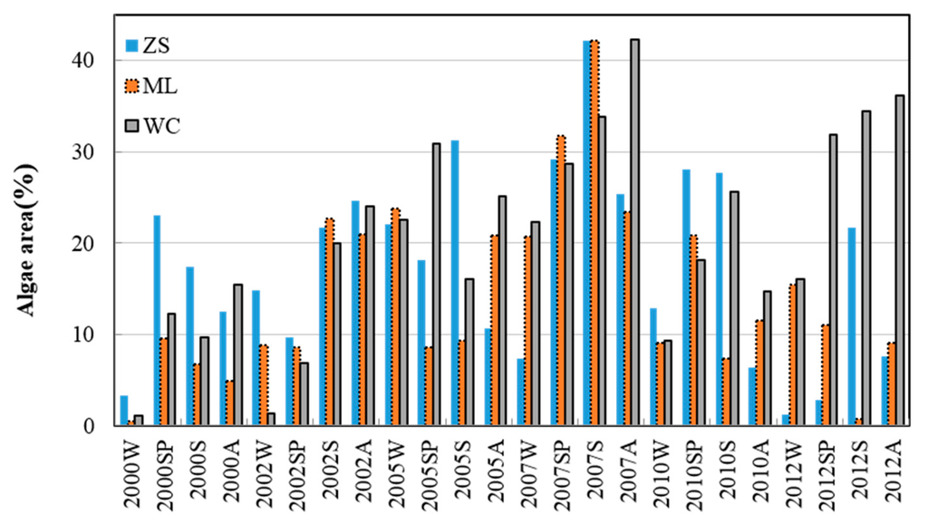 In general, massive algal bloom coverage did not occur frequently before 2005, such that the total algae area for the three divisions was largely less than 25% of the lake surface area. Algae areas increased from 2005 to 2007, with the algae area of ZS covering up to 45% of the whole lake division area in the spring and autumn of 2007. After 2007, the phenomenon of algae blooms had been controlled to some extent, the algae area in ZS and ML was greatly decreased. However, the WC region continued to have elevated blooms, with algae covered area proportions of approximately 35% in 2012.
