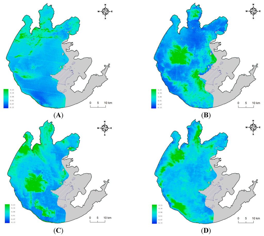 where is the baseline reflectance of each band, which had been corrected by Rayleigh scattering. We used a threshold of −0.004 as the distinction criteria of algae pixels and non-algae pixels, following recent studies [23,41,42]. The daily algae area was mapped and then the seasonal changes were determined from daily data using a moving average method.
