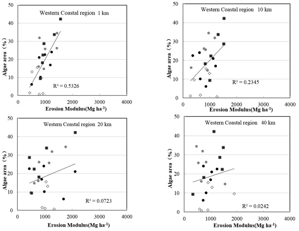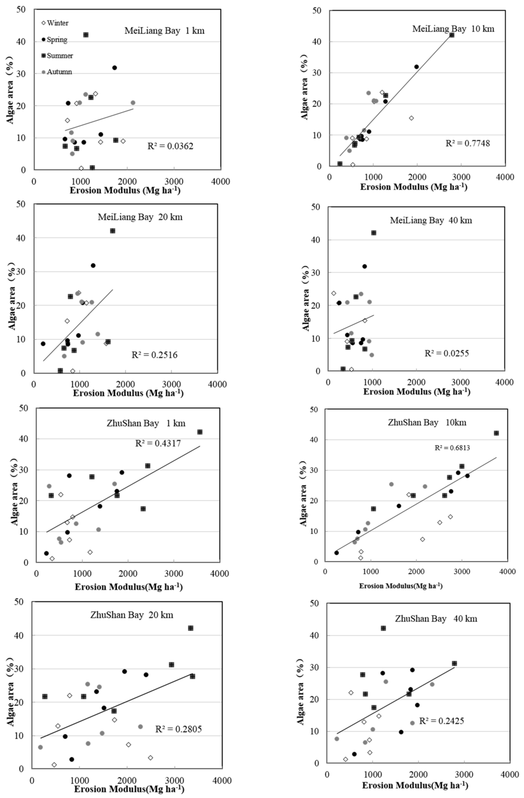 The relationship between soil erosion and lake water quality is discussed within each region, which was divided into four groups according to different seasons (the 1 km, 10 km, 20 km and 40 km regions are shown). These data are plotted in Figure 5 using a scatter diagram of the erosion modulus and algae area, with the erosion modulus designated as independent and the algae area designated as dependent.