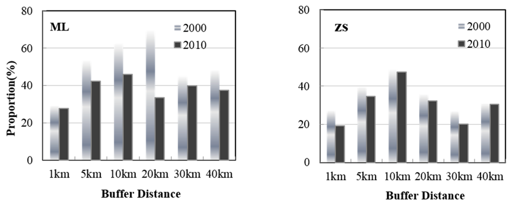 Arable land proportion within each buffer region between 2000 and 2010.