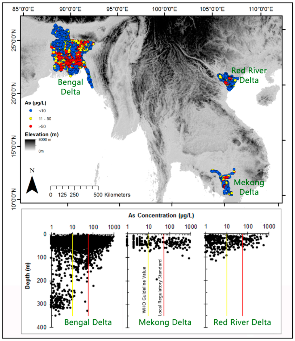 Although the use of groundwater as a source of drinking water in Asia has a long history, it was only during the period between 1970 and 2000 that it markedly expanded to its current extent [27,28]. The reason for this increased usage was to avoid vector borne cholera and diarrheal diseases (one of the top causes of morbidity and mortality in the region and particularly associated with surface water sources) [28,29]. The move significantly reduced vector borne diseases in the region, but inadvertently introduced naturally occurring arsenic, which is particularly extensive in Asian deltas, the impact of which was discovered during the 1990s. This has been termed the “largest mass poisoning of a population in history” [30]. A study in 2010 estimated that around 20% of all the deaths in Bangladesh are linked to the arsenic poisoning [31].