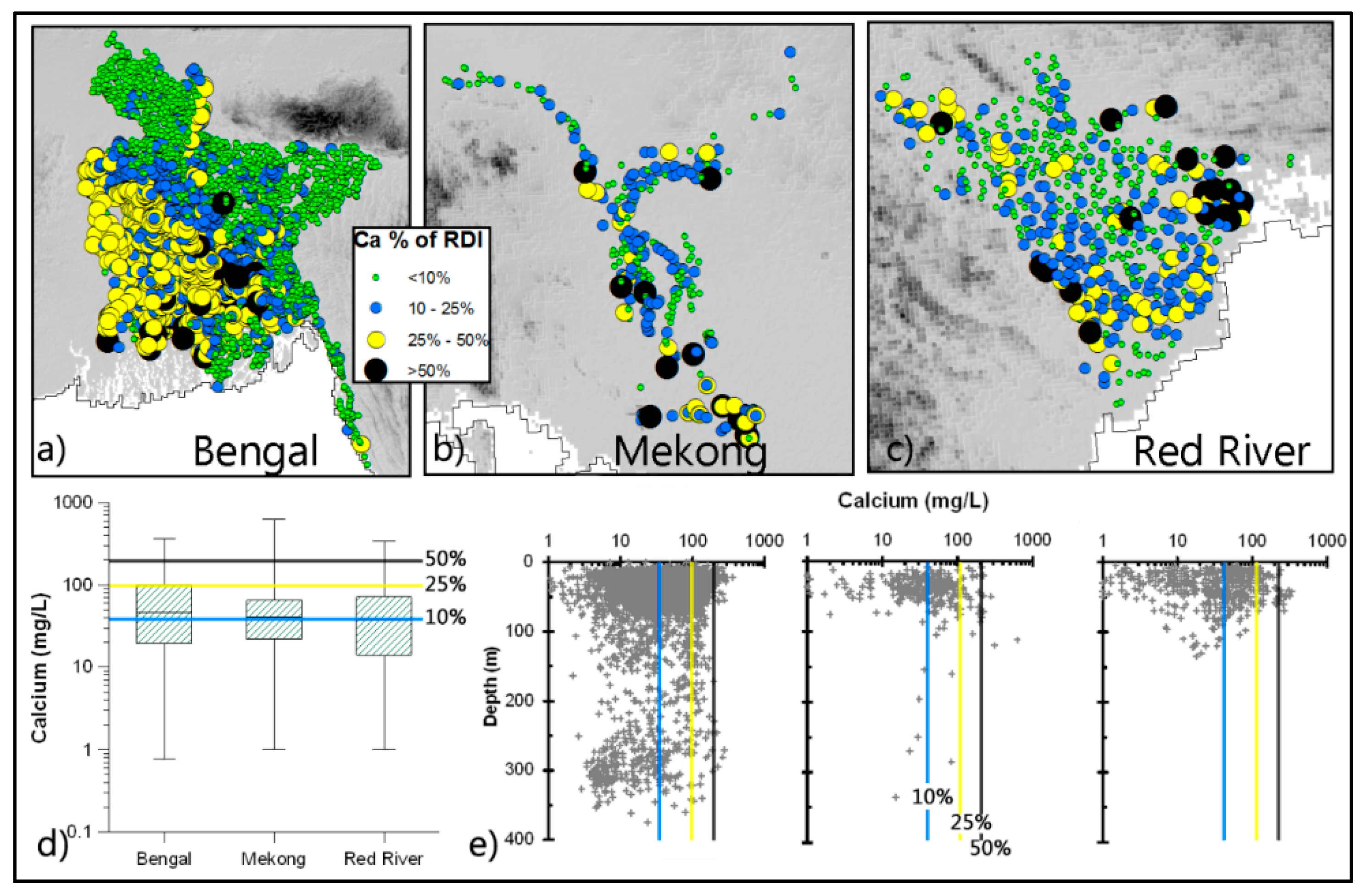 The components in drinking water are generally analysed in order to avoid passing on chemicals harmful to human health. In contrast, little, if any, attention is given to constituents beneficial to health. WHO guideline values for drinking water reflect this and are essentially set for toxic elements, along with micro-nutrients that are essential at certain concentrations but become a health problem when in excess [68]. No guideline values are provided for essential macro-nutrients, except for aesthetic purposes (e.g., the limits for Cl and Na are set at 250 and 200 mg/L, respectively, as concentrations above these levels make the water taste salty). Most groundwater in Asian deltas is rich in mineral nutrients (e.g., Ca, Mg, Fe) occasionally providing >50% of the RDI. This drinking water contribution varies spatially as individually managed tubewells are distributed over a large region and groundwater composition varies.