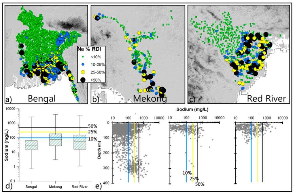 Although Na is a macro-nutrient, its intake is generally considered only in terms of that derived from food, along with added salt for flavour. However, some groundwaters in coastal areas provide significant amounts of Na when used as a source of drinking water, and, when combined with food derived Na, can result in levels of Na intake exceeding the WHO recommended daily amount of 2 g/d. This extra Na can lead to high blood pressure and hypertensive disorders in some local populations [33,34]. The high levels of Ca and Mg in this deltaic groundwater are often accompanied with high levels of HCO3. Studies have shown that high HCO3 in drinking water may counter the impacts on blood pressure due to excess Na [76,77], although it is not currently known whether this is the case for the coastal populations in living in Asian deltas.