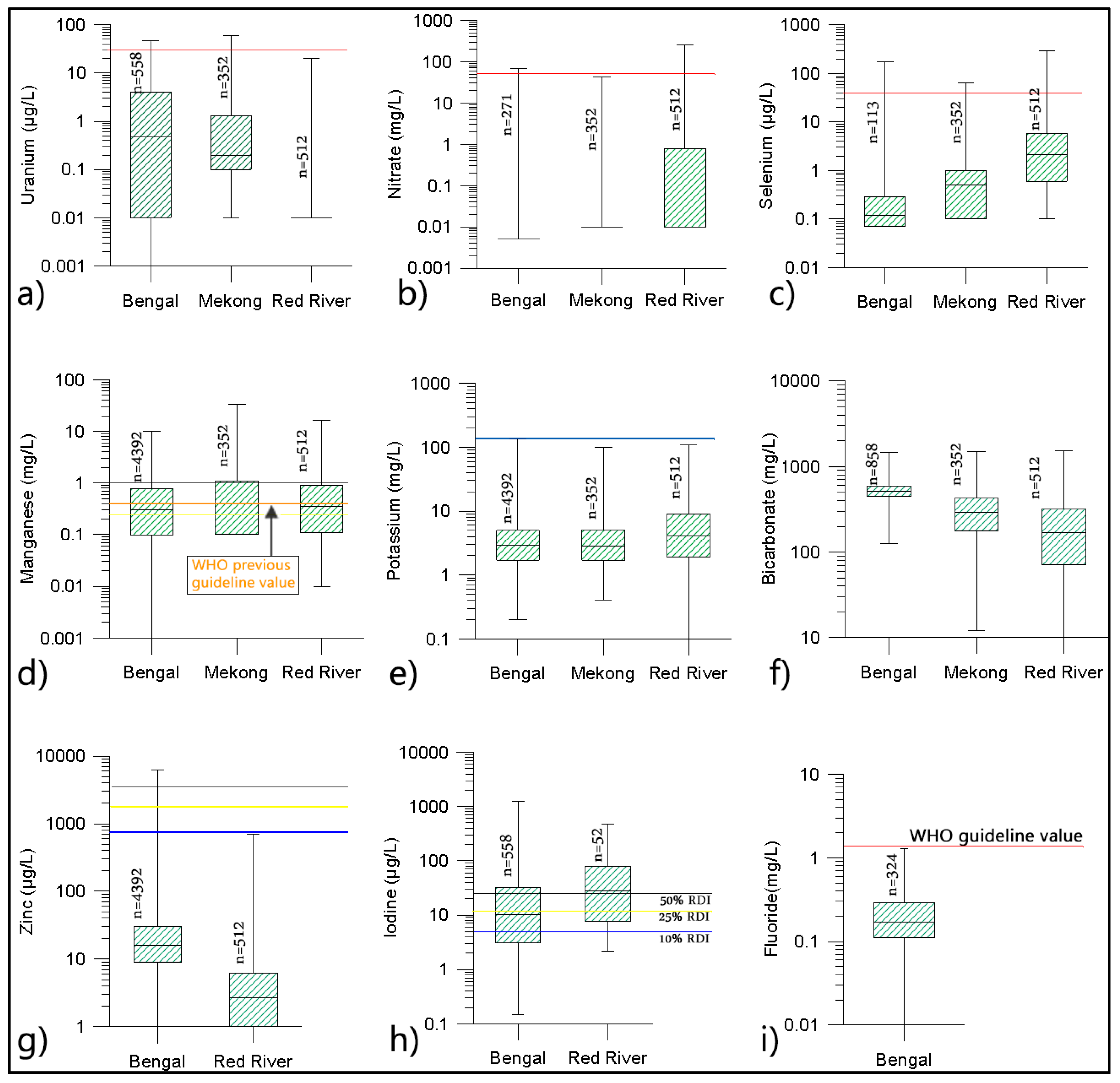 Basic statistical properties (minimum, maximum, median, lower and upper quartile) for various groundwater ions (U, NO3, Se, Mn, K, HCO3, Zn, I, and F respectively for a–i) from the deltas are shown. See text for details.