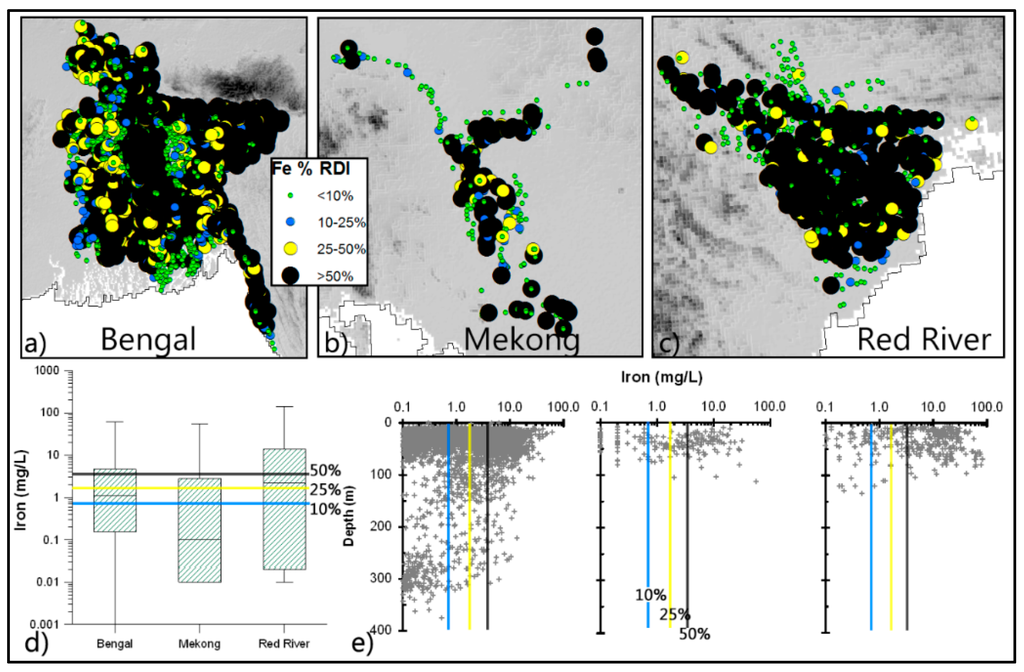 Iron (Fe): Significant amounts of dissolved Fe are present in the analysed groundwaters, with 64% of the wells containing concentrations above 0.3 mg/L, the WHO recommended value, which is for aesthetic reasons and not a health-based guideline for Fe in drinking water. Around 32% of wells in the deltas provide more than 50% of RDI for Fe, while 17% provide more than the daily Fe requirement for an adult. The occurrence of high Fe in groundwater has a regionalised spatial pattern and is relatively higher in shallower aquifers (Figure 6).