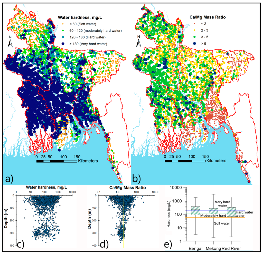 Water hardness and Ca/Mg mass ratio in Bangladesh groundwater. (a) Most of the hard or very hard water are found in the southwest region; (b) Ca/Mg mass ratio is above 2 most parts except east and southeast region of the country; (c) Hardness of water varies irrespective of the well depths; (d) Ca/Mg ratio is more homogeneous and around 2 in deeper (>100 mbgl) wells contrary to their shallower depths; (e) Box plots indicating hardness of water in other Asian deltas.