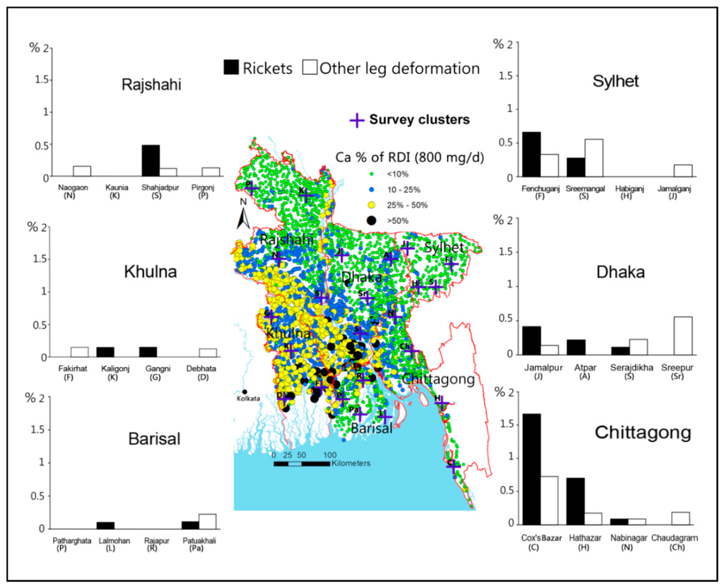 The widespread nature of “Ca undernutrition” almost certainly contributes to the emergence of rickets in Bangladesh and the prevalence of osteoporosis [63]. In south-east Bangladesh, rickets caused by Ca deficiency appears to affect some 4% of children. A separate survey in several sub-districts indicates a tentative spatial association with the well water Ca (Figure 9). Dietary intake, estimated from dietary surveys, contribute around 200 to 400 mg/d of Ca, which is generally less than 50% of the RDI [53,61]. However, if food habits are assumed to be similar throughout the country then it might be anticipated that in some areas people should not suffer from Ca deficiency because around 50% of the RDI is contributed by drinking water in those areas. Bangladesh is a sunny country where many people spend a considerable amount of time outdoors with opportunities to produce adequate vitamin D. The two most important nutrients for bone health are vitamin D and Ca and in the presence of sufficient vitamin D, Ca deficiency may be actively influencing bone health in the population of Bangladesh.