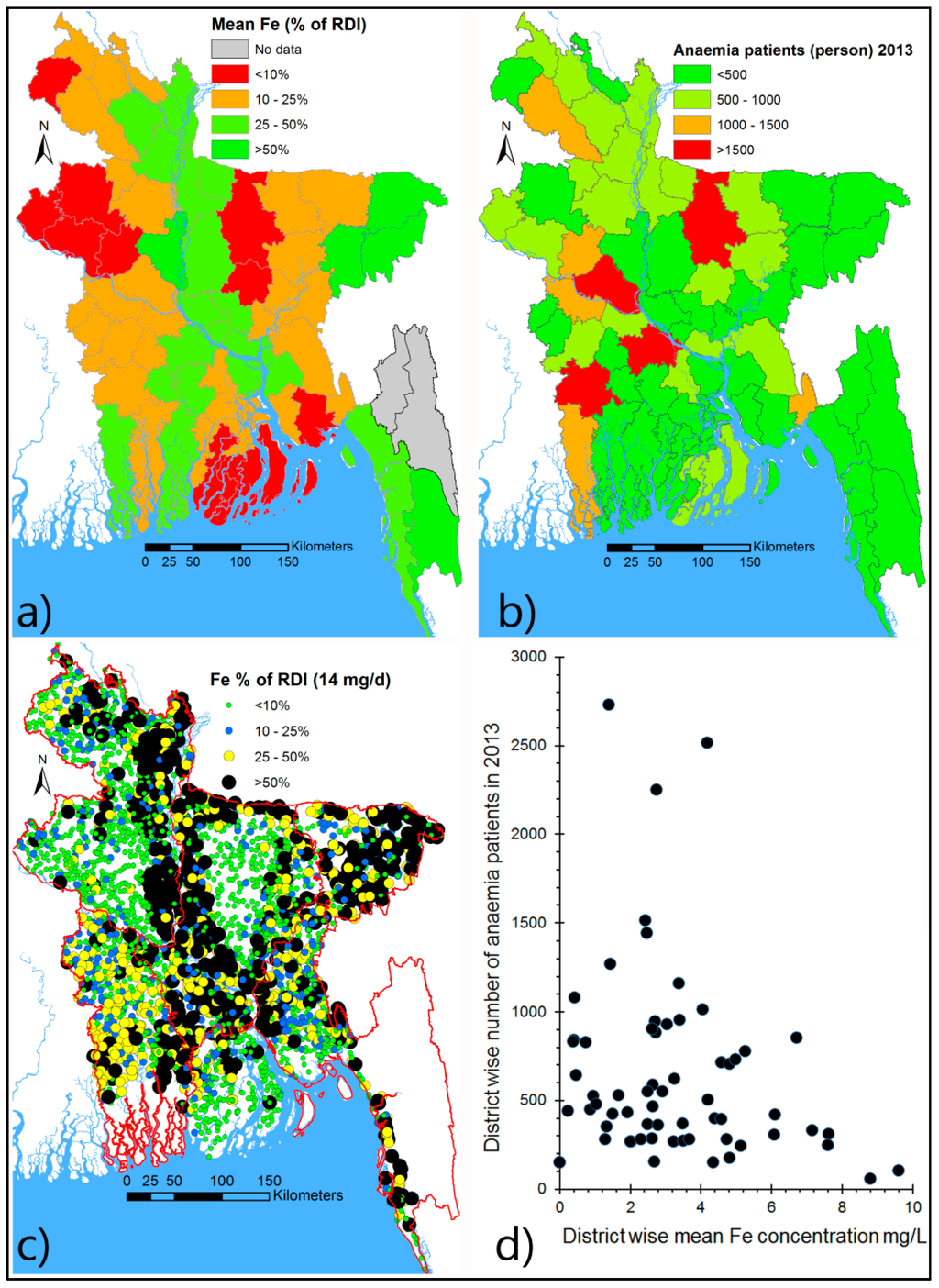 In Bangladesh >50% of pre-school children, women of reproductive age and adolescents suffer from Fe deficiency-related anaemia. Iron deficiency in Bangladesh should be obvious if only food intake is considered [53] but most tubewell water contains significant amounts of Fe (occasionally around 100% of RDI or more, Figure 10). However, drinking water may completely lack folate—also important in preventing anaemia. Elements (e.g., As) that are detrimental to health also exist in wells that have higher Fe concentrations e.g., [16]. A preliminary analysis of district wide anaemic patients (who attended hospitals in 2013, http://www.dghs.gov.bd, accessed on 5 August 2014) indicates that the numbers of patients are low in areas where tube wells have a higher Fe concentration (Figure 10). The analysis is not adjusted for age or sex and neither does it consider other confounding factors due to lack of information. Bio-availability of the Fe in drinking water is also an undetermined factor, which depends on types of consumed food, and method used for water storage after collection. Previous studies in Bangladesh [65,66] indicate significant absorption of Fe by the human body can be derived from drinking water.