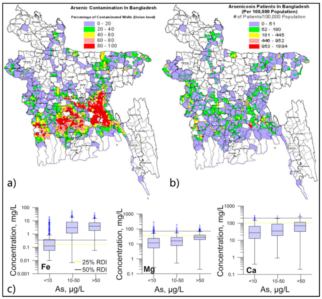 Spatial variation of well water concentration of As and arsenicosis patients in Bangladesh [67]. (a) Percentage of tubewells contain As concentration, above 50 µg/L—Bangladesh standard for drinking water As, at union level; (b) distribution of arsenicosis patients in Bangladesh. The patients’ data have a number of limitations, in particular the influence of beneficial mineral nutrients on patients is not known; (c) High As wells in Bangladesh indicate higher concentrations of Fe, Mg and Ca.