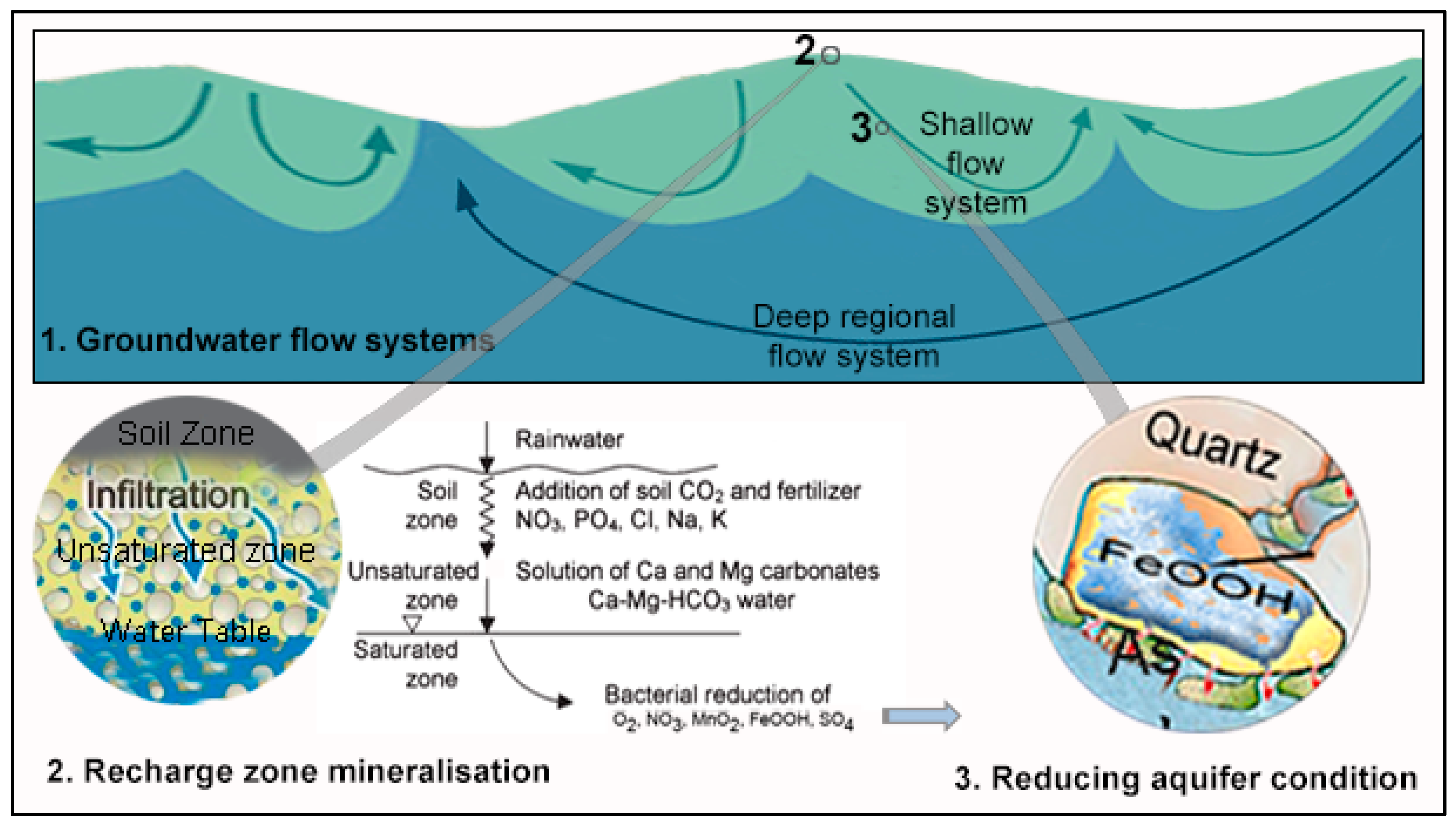 Geological history, hydrogeology and aquifer geochemical processes determine what kind of mineral nutrients and toxicants can be expected in an aquifer e.g., [78]. In terms of its effects on human health, an aquifer can be characterised in terms of the presence or absence of certain nutrients and toxicants. Such a characterisation may, in turn, help both individuals and/or health professionals to appreciate the contribution from groundwater to an individual’s nutrition and risk from toxicants. There are three main processes that affect this: recharge, geochemical processes, including ion-exchange and the differentiation of groundwater flow into shallow and deep systems (Figure 12). Like many other aquifers, these processes in the Asian deltaic aquifer lead to the presence of some nutrients and toxicants and the absence of others.