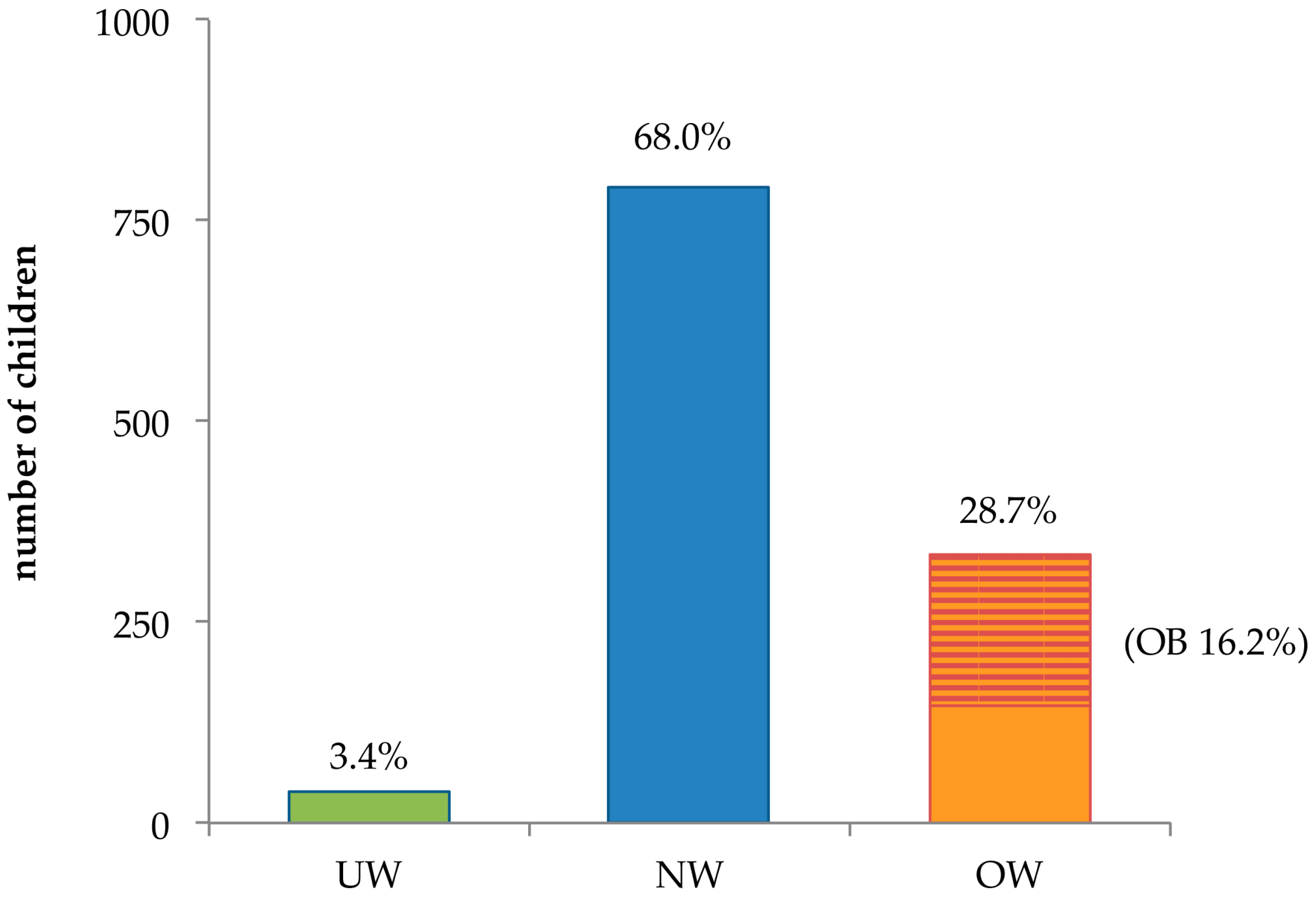 The cohort was composed of 1164 children, of whom 1111 (95.4%) were born in Italy. Regarding their weight status, 39 (3.4% of the total) were UW, 791 (68.0%) were NW, and 334 (28.7%) OW. The latter category includes 188 children who were OB (16.2%) (Figure 1).