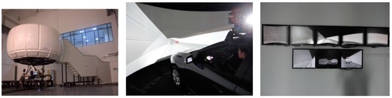 The driving simulator of Tongji University, as shown in Figure 1, is a motion-base simulator with eight degrees of freedom (DOF). A real car is placed in the middle of the experimental cabin as the test vehicle. A visual system, with five projectors, projects the road model on the spherical curtain. The simulator provides a 250° (horizontal) × 40° (vertical) forward view of the roadway from the driver’s position. The performances of the motion system, feedback systems and the cockpit have reached the international advanced level. The simulator is monitored by the controlling software (Scaner™ Studio v1.4 by OKTAL, Paris, France) for system control, scene creation, data acquisition, data analysis, etc. The software enables the creation of accurate models and a variety of scenarios. The validation of the Tongji simulator in researching underground road driving behavior has been verified in several published studies [14,29].
