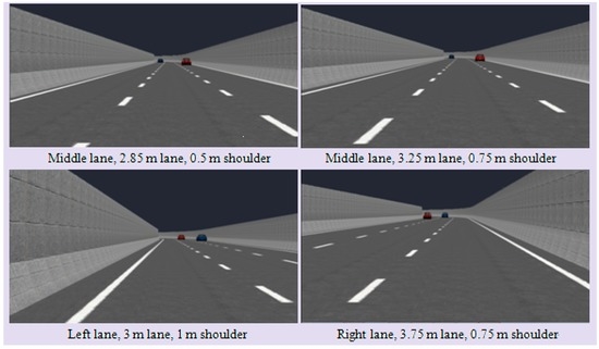 The impact on the driving behavior of the participants was studied in terms of three independent road alignment variables including lane width, shoulder width, and lane position. According to urban expressway design specifications in China [32,33], five lane width values are suggested—2.85, 3.0, 3.25, 3.5 and 3.75 m—and three shoulder width values are suggested—0.5, 0.75 and 1.00 m. Scenarios with different combinations of these suggested lane width and shoulder width values were tested. Figure 2 shows snapshot examples of the simulation scenario.