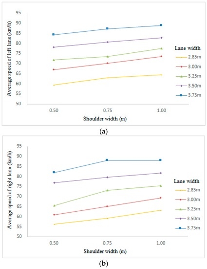 Effect of shoulder width on average speed in side lanes. (a) Effect of shoulder width on average speed in left lanes; (b) Effect of shoulder width on average speed in right lanes.