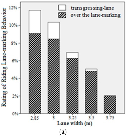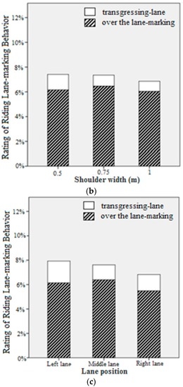 Figure 7 presents results for the rating of riding lane marking behavior in different test cases. As expected, objective safety was the highest with the lane width of 3.75 m and shoulder width of 1 m (Figure 7a,b) except in the case of constantly weaving. Meanwhile, vehicles in the middle lane had the highest rate of over the lane marking in most of the cases; however, they had the lowest rate of transgressing-lane. The reason is that drivers on the middle lane were less affected by side wall. They would have the highest deviation range. At the same time, they could stay in the requested driving lane well and seldom occupied other lanes. Vehicles on the left lane had the highest rating of transgressing-lane as shown in Figure 7c indicating that they tended to drive on the road shoulder.