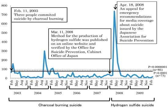 In the last two decades, Japan has experienced two different types of suicide epidemics and subsequent media reports. On 11 February 2003, a group of young people who met for the first time in Iruma City in the Saitama prefecture committed group suicide by carbon monoxide poisoning produced by burning charcoal. In the previous few days, the first three individuals who committed suicide had initially met through an Internet suicide site. This type of group suicide was unprecedented and peculiar and, thus, was repeatedly reported by the mass media in the ensuing days. Following the intensive reporting of this unusual case, group suicides by Japanese young people who met via the Internet and tried to commit suicide by burning charcoal drastically increased; this type of group suicide has been called net-jisatsu, or Internet suicide [17,18,19]. Another example of this phenomenon in Japan was suicide by inhaling hydrogen sulfide gas, which occurred in 2008. After the formula for making hydrogen sulfide at home was made publicly available online on 11 March 2008, the number of suicides in Japan by hydrogen sulfide exceeded 1000 individuals between January and November 2008, which was 35 times the number reported for a comparable period in 2007 [10,11,20,21]. This dramatic increase was presumed to be due to information about this suicide method available on websites [22].