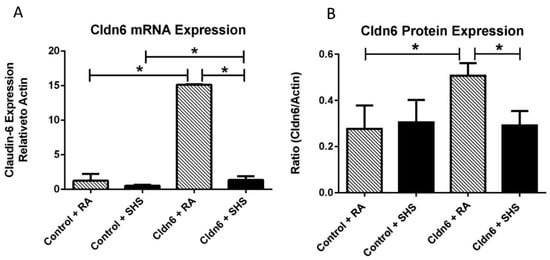 (A) Claudin-6 (Cldn6) mRNA expression was significantly decreased in the lungs of control mice following secondhand tobacco smoke (SHS) exposure and up-regulation of Cldn6 in Cldn6 transgenic (TG) mice was inhibited in TG mice exposed to SHS (n = 6 per group). The mRNA from each group was normalized to β-actin and representative data are shown with * p ≤ 0.05; (B) Immunoblotting revealed that Cldn6 protein was unchanged in control mice following SHS exposure and that protein levels were significantly inhibited in Cldn6 TG mice exposed to SHS. Representative blots (n = 6 per group) were densitometrically normalized to β-actin and ratios of Cldn6/β-actin are presented with * p ≤ 0.05.