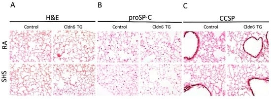 Histological analysis via H&E staining revealed no evidence of tissue simplification or any discernable changes in general lung morphology (Figure 2A). Immunohistochemical staining was next employed using cell-specific markers in order to assess whether there were any cellular changes in the proximal or distal lung compartments. Staining for the propeptide of Surfactant Protein-C (proSP-C) revealed no alterations in the qualitative abundance of alveolar type II cells in the distal lung (Figure 2B). In fact, there were no discernable differences in the relative abundance of alveolar type II cells in Cldn6 TG or controls regardless of SHS exposure. Immunohistochemical assessment of proximal lung tissue was completed using a marker for Club Cell Secretory Protein (CCSP) elaborated by non-ciliated Club cells in the conducting airways. As was similarly observed relative to proSP-C staining, CCSP immunostaining was consistent in each of the experimental groups and controls, suggesting no significant alterations in proximal cell quantity (Figure 2C).