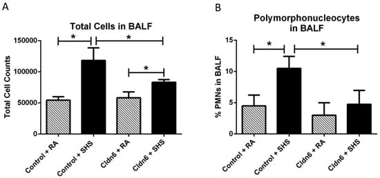 (A) Total bronchoalveolar lavage fluid (BALF) cells were significantly increased in control mice + SHS when room air (RA)-exposed controls. There was significantly less total cellularity in BALF from Cldn6 transgenic (TG) mice exposed to SHS when compared to SHS-exposed controls; (B) The percentage of polymophonuclear cells (PMNs) was significantly higher in control mice + SHS compared to control mice + RA and PMN quantity was unchanged in Cldn6 TG mice following SHS exposure. Data are representative of experiments involving six mouse lung samples per group and * p ≤ 0.05.