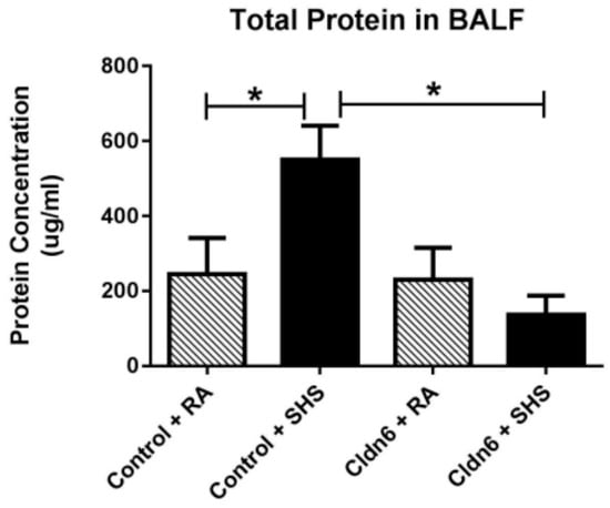 Total BALF protein was assayed using the BCA technique to demonstrate vascular permeability. Protein was significantly elevated in control mice following SHS exposure and there was no change in total BALF protein from Cldn6 TG mice + SHS when compared to RA groups. Data are representative of experiments involving six mouse lung samples per group and * p ≤ 0.05.