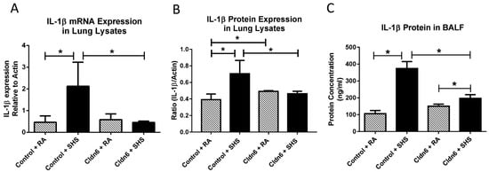 IL-1β mRNA (A) and protein (B) were assayed in whole lung lysates by qPCR and immunoblotting, respectively. SHS increased IL-1β transcription and translation in control animals, but expression of both message and protein were unchanged in SHS-exposed Cldn6 TG mice; (C) ELISAs were used to detect secreted IL-1β in BALF. Despite significant increases in the secretion of IL-1β following SHS exposure, there was significant inhibition of IL-1β in Cldn6 TG mice exposed to SHS when compared to SHS-exposed controls. Data are representative of experiments involving six mouse lung samples per group and * p ≤ 0.05.